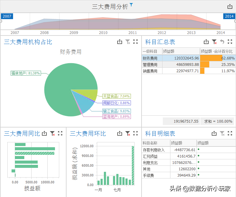 当然,用户可依据自身需要从不同维度对相应图表进行分析,比如查看”财务费用”在”2012年12月”各个子公司的情况,如下图:
