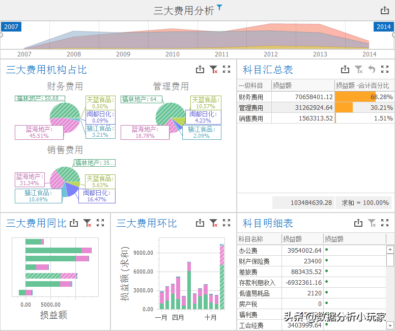 简而言之,在数林商业智能软件中用户通过分析主题设计依据自身想要分析的维度,对三大费用进行联动、钻取、切片等分析,帮助用户省去复杂繁琐的数据整理工作,轻松便可实现对企业三大费用的数据分析,不论是多组织、多账套的数据都可轻松实现。