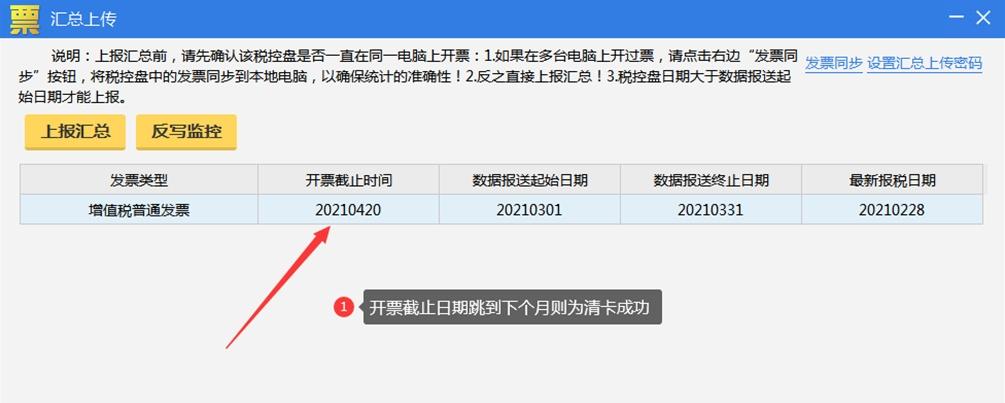 划重点:必须按照顺序操作,上报汇总→申报→清卡,如果没有按照此步骤操作,将无法完成清卡。操作完成后企业操作人员需要查看一下,开票截至日期是否为下个月的日期。