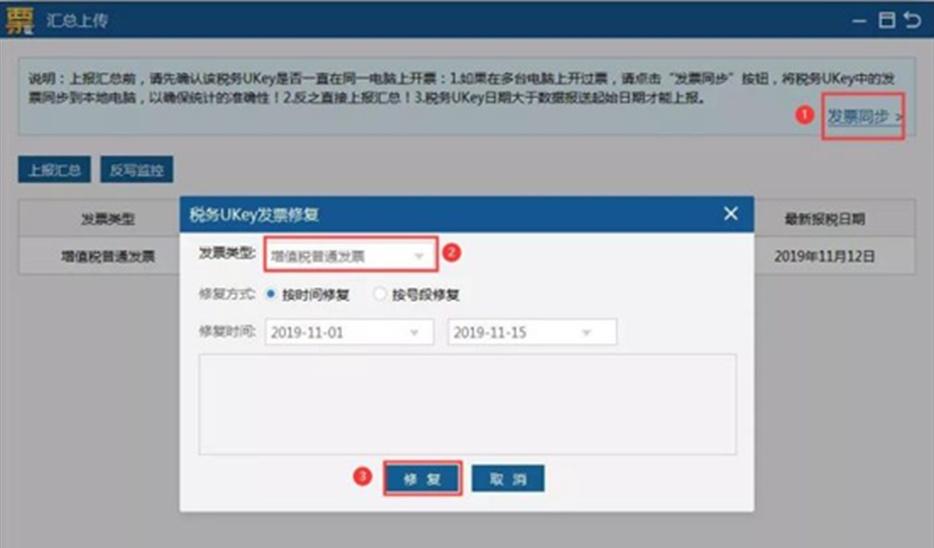 步骤2:汇总上传前准备。上报汇总前,请先确认该税务UKey是否一直在同一电脑上开票,如果在多台电脑上开过票,请点击右边【发票同步】按钮,每个票种都要进行发票修复,将税务UKey中的发票同步到本地电脑,以确保统计的准确性;