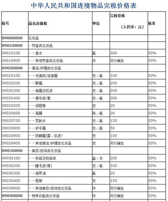 海关总署自2012年4月15日起,执行重新修订的《中华人民共和国进境物品归类表》和《中华人民共和国进境物品完税价格表》。其中完税价格表第01010700项显示,奶粉一栏的完税价格为200元,税率10%。并且根据新《归类表》,进境酒、烟草、化妆品的税率均为50%。