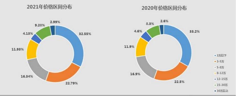 值得一提的是,数据显示2021年二手车销量中3万及以下的车辆占主要达32.55%,说明二手车在一定程度上门槛还是比较低的。