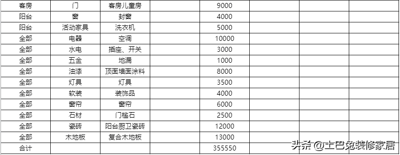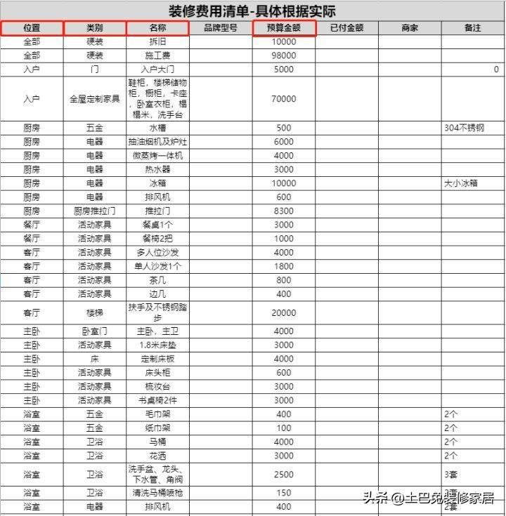 不管钱多钱少,最重要的是怎么控制预算。哪怕装修费上百万,也得有一张预算控制表。