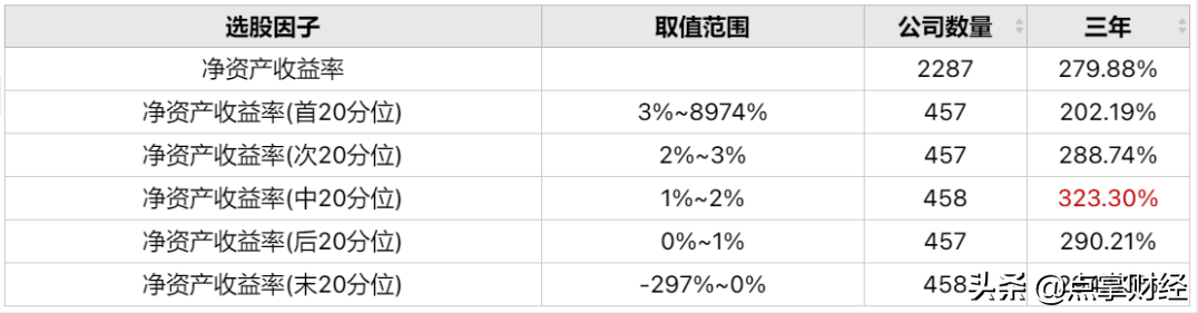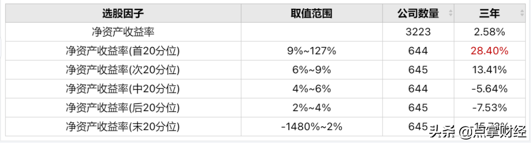 20180129-20210128上证指数下跌17.82点,跌幅0.5%,市场基本处于震荡市阶段,净资产收益率在首20分位9%~127%的公司股价涨幅最高,且涨幅与ROE呈正向波动。具体相关数值如下图表: