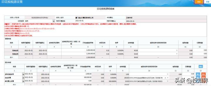 3、进入申报表填写界面,选择印花税申报。若提示无可申报的税源信息,则需查看【认定信息】中的纳税期限是否选择正确,若确认无误可以点击【税源采集】按钮进行税源采集。