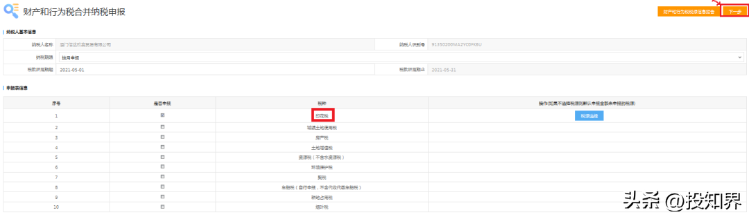 5、税源录入完成后返回“财产和行为税合并纳税申报”页面,勾选“印花税”,点击页面右上角的“下一步”按钮,进入申报明细页面。申报明细页面将展示根据税源自动填写的“财产和行为税纳税申报表”,确认相关信息无误并点击“申报”按钮,即可完成申报。