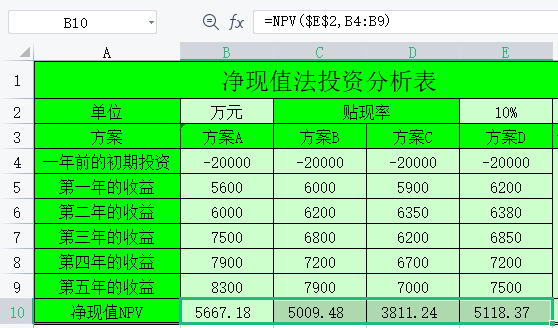 $E$2是贴现率,数值为10%。B4:B9是方案A初期投资到第五年的收益值。