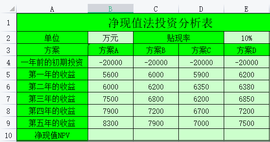 如下图的多个投资方案需要使用财务净现值法来择优,在excel中可以使用净现值NPV()函数来计算。