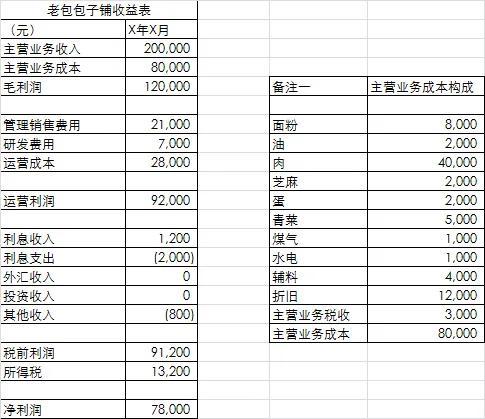 做包子的成本,包括面粉啊,油啊,猪肉啊,芝麻啊,辅料啊;包子炉用的煤气费啊,水费啊,卖包子的税收,以及每个月各种做包子用的工具的折旧费用等等,这些每月总计8万;这是主营业务成本(Cost of Revenue)