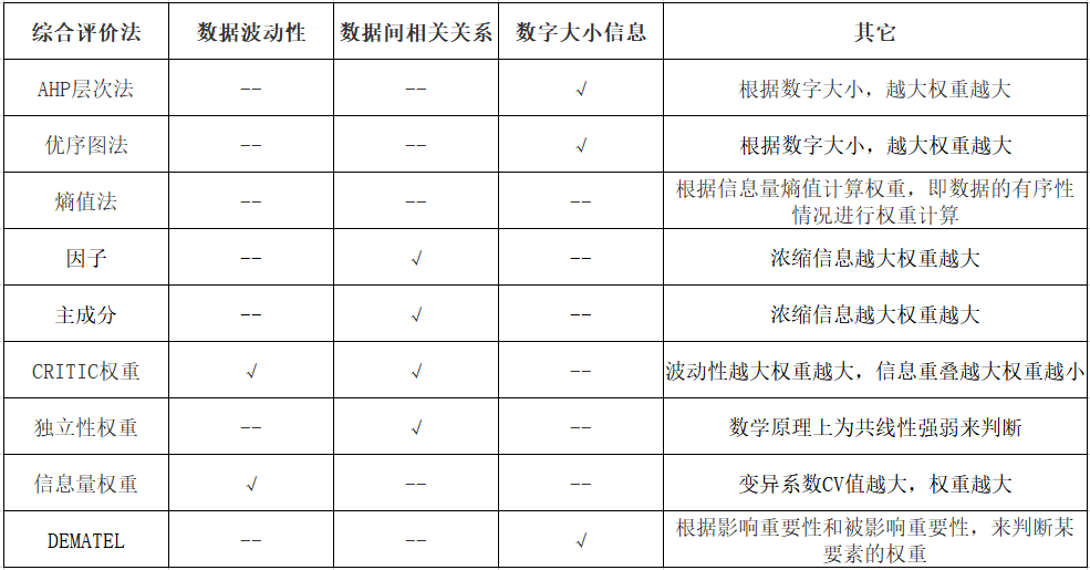 权重计算的确定方法在综合评价中重中之重,不同的方法对应的计算原理并不相同。在实际分析过程中,应结合数据特征及专业知识选择适合的权重计算以上九种权重计算方法特征如下表: