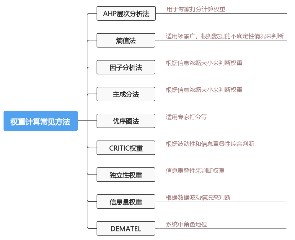 此类方法利用数字的相对大小信息进行权重计算;此类方法为主观赋值法,通常需要由专家打分或通过问卷调研的方式,得到各指标重要性的打分情况,得分越高,指标权重越大。