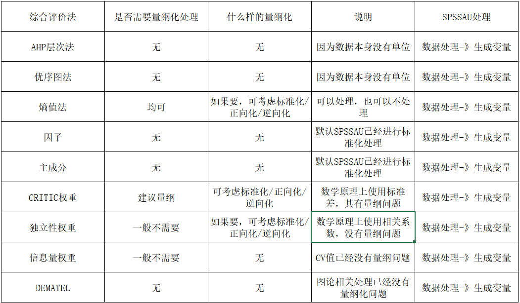 九种常用权重计算方法是否需要量纲化处理、需要进行什么样的量纲化处理详见下表:
