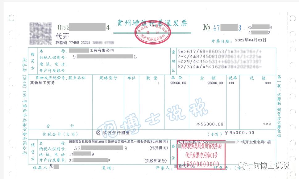 这张金额为95000元的普通发票印证了一个事实,即本次小规模纳税人免征增值税,优惠范围的的确确涵盖了自然人。以这张发票为切入点,何博士想提醒广大纳税人,新政策下接受自然人代开发票,要注意几个要点: