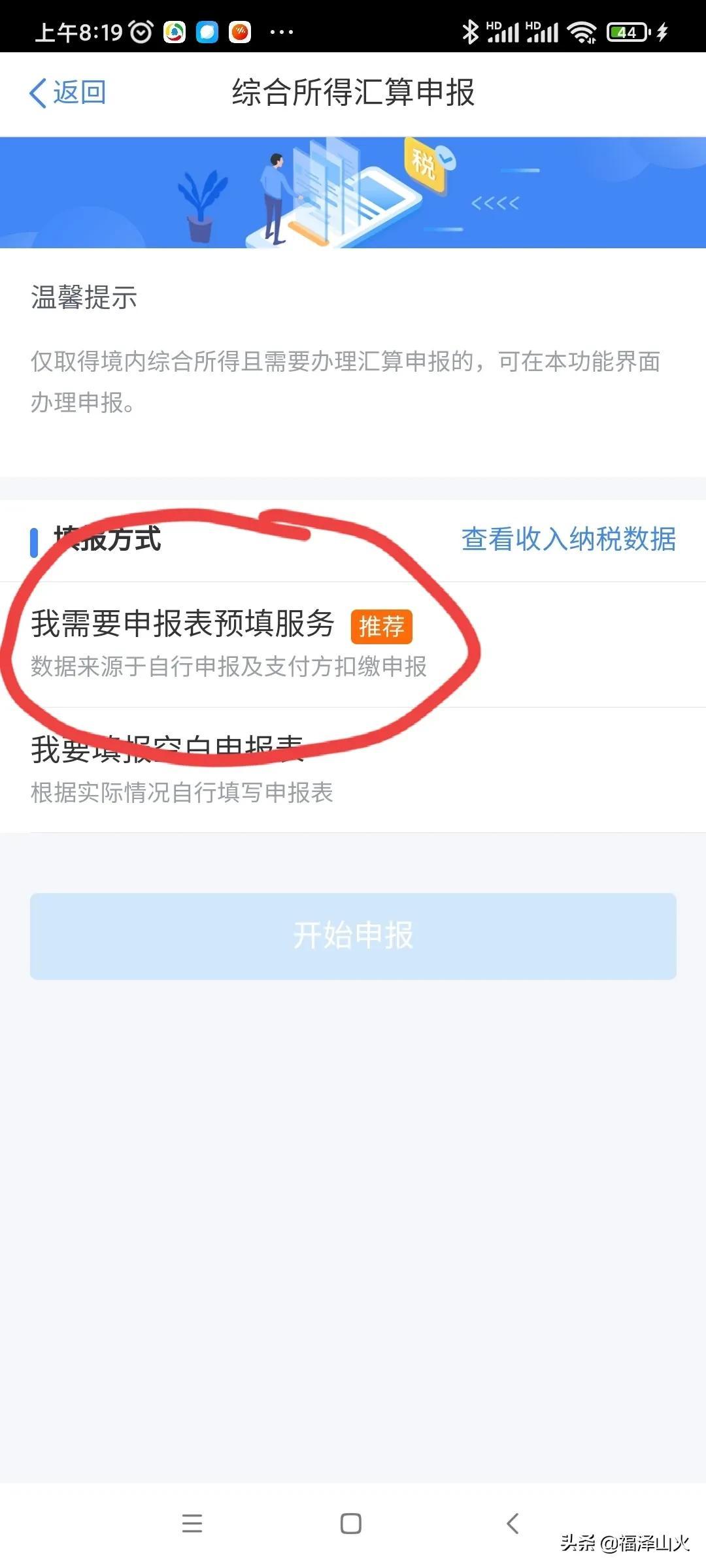 1、打开个人所得税app,我们就可以看到下面这个界面,点击开始申报。现在窗口刚开放,退税人数比较多,可能需要预约,直接预约一个时间就可以了。