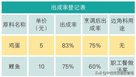 出成率是原料的利用率,对它的管理与控制,店长要时刻监督厨师长,测试并规定出各种原材料的出成率指标,尤其是昂贵食材的加工出成率,应作为检查控制的重点。