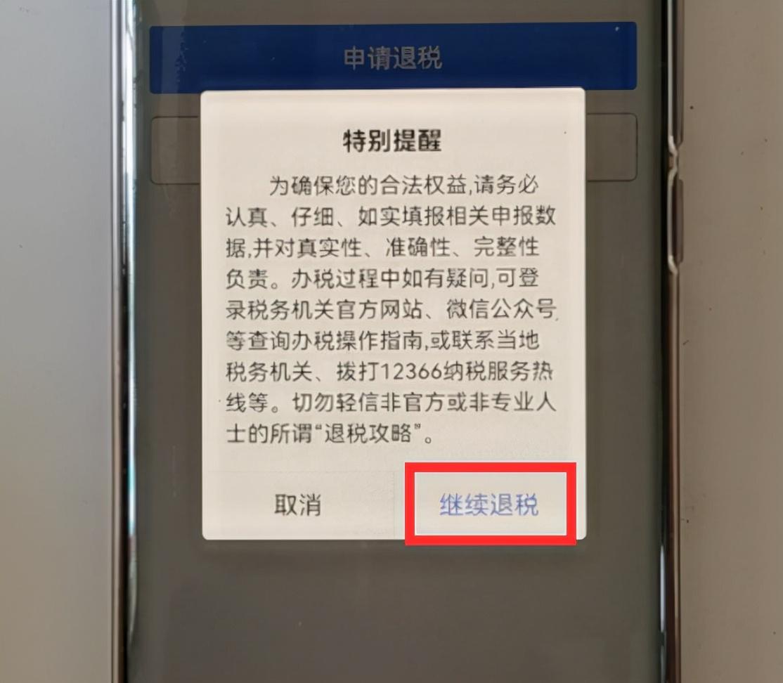 在弹出的窗口中点击“继续退税”按钮,就完成了提交申请。然后就是等税务机关把税款退还给我们了。