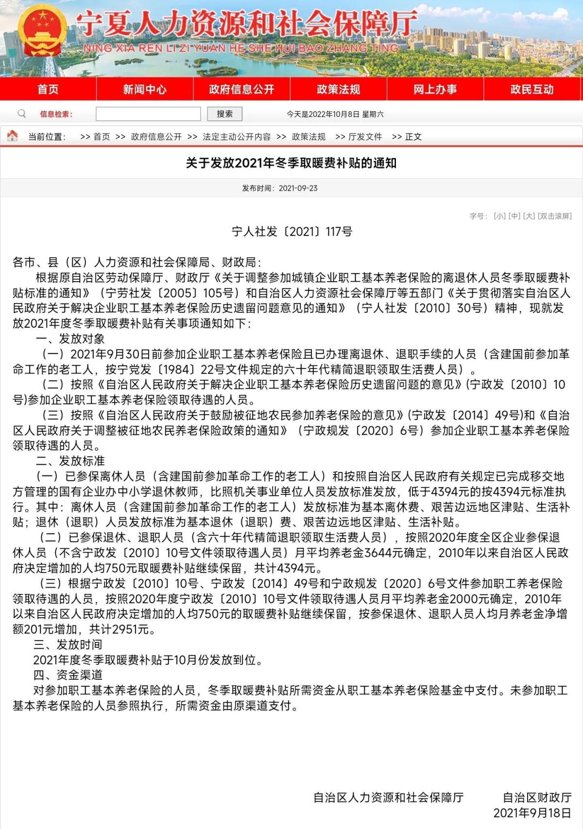 目前,宁夏自治区的企业退休人员冬季取暖费标准最高,是一个月的上年度企业退休退职人员养老金+额外增发的750元取暖补贴。不过,宁夏自治区的冬季取暖费补贴标准是分为两类人群。一类是已经参保的退休、退职人员(含60年代精简退职领取生活费人员),这类人群的平均养老金水平较高,2021年达到了3813元,因此这类人群的冬季取暖费待遇是4563元。另一类人群是根据宁政发2010年10号等文件参加职工养老保险领取待遇的人员,冬季取暖费标准是3120元。