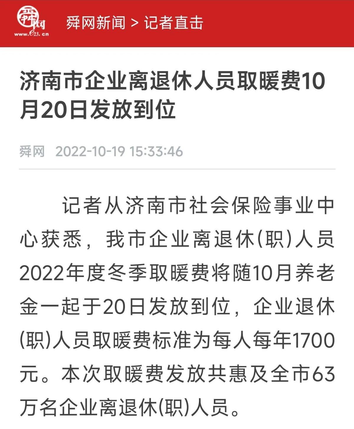山东省的冬季取暖费标准是1700元,也是于10月20日逐步发放到位的。