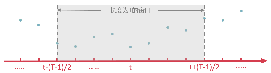 假设我们有一个时间序列 y = {…, y_(t-2), y_(t-1), y_t, y_(t+1), y_(t+2), …},如下图所示。另外,假设我们有一个作用在时域 t 上的过滤函数 F(注:这个 F 的具体形式根据不同的移动平均算法而不同)。