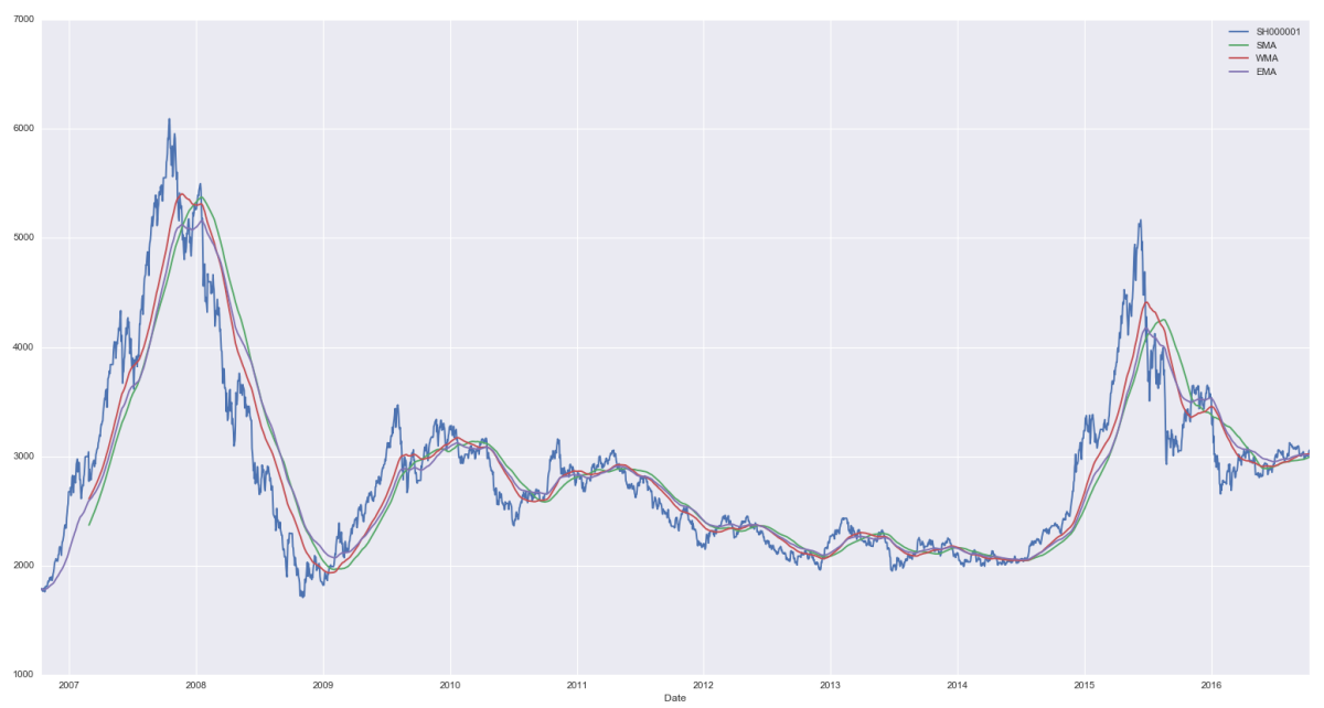 简单移动平均(Simple Moving Average, SMA)就是对时间序列直接求等权重均值,因此使用简单。但其最令人诟病的就是它的滞后性。从上图不难看出,随着计算窗口 T 的增大,移动平均线越来越平滑,但同时也越来越滞后。以 120 日均线为例,在 2015 年 6 月份之后的大熊市开始了很长一段时间之后,120 日均线才开始呈现下降趋势。如果我们按照这个趋势进行投资,那这个滞后无疑造成了巨额的亏损。