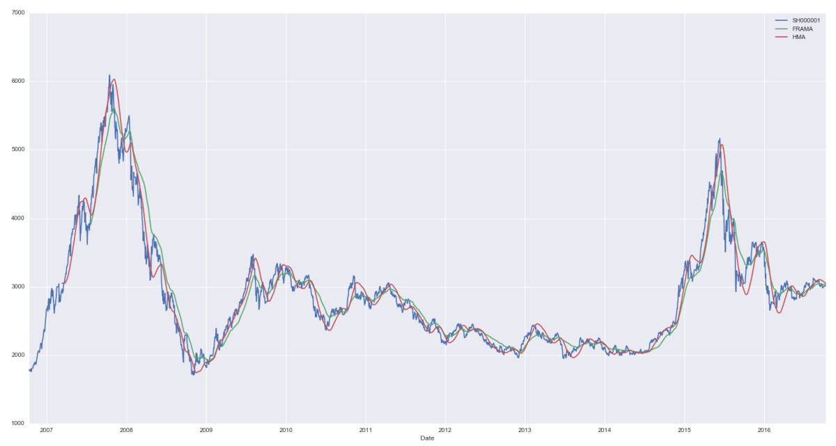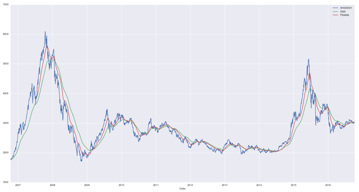 一个优秀的移动平均算法计算出来的均线应在时间序列自身波动不明显的时点足够平滑,而在时间序列自身发生巨变时迅速捕捉、将滞后最小化。要想达到这种效果,就必须利用时间序列自身的特点。分形自适应移动平均算法就是这样一个有力的工具。