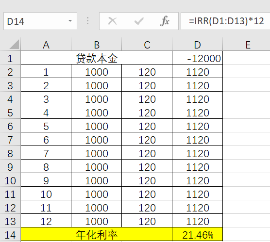 放款后现金流为-12000元,每月回款正向现金流1120元,通过EXCEL的IRR函数,计算出此笔贷款年化利率21.46%。这种算法适用于所有贷款的年化计算。