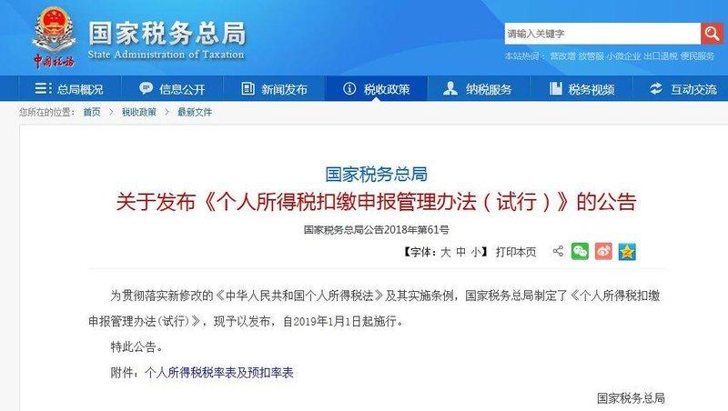 按照国家税务局12月21日发布的国家税务总局关于发布《个人所得税扣缴申报管理办法(试行)》的公告提到,国家税务总局制定了《个人所得税扣缴申报管理办法(试行)》,予以发布,自2019年1月1日起施行。简单就是,这个办法也出台了。
