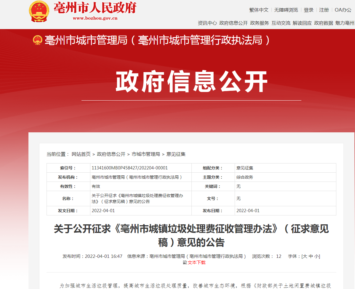 记者从亳州市有关部门获悉 ,为加强城市生活垃圾管理,提高城市生活垃圾处理质量,改善城市生态环境,亳州市城市管理局、市税务局市财政局、市发展改革委联合起草了《亳州市城镇垃圾处理费征收管理办法》(征求意见稿)现公开征求社会各界意见,时间为2022年4月1日至2022年4月30日。