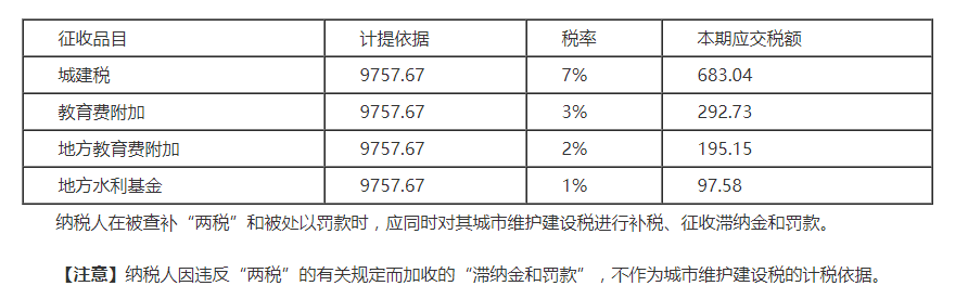 【举例】甲公司2017年6月份应缴纳增值税9757.67元,计算其附加税,并编制税金及附加计提表。