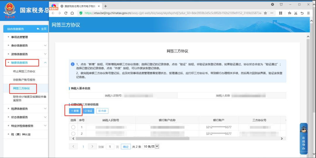 二、制度信息报告—网签三方协议中点击【新增】填写协议申请,下一步受理成功后,点击【验证】协议,协议状态验证通过即可。
