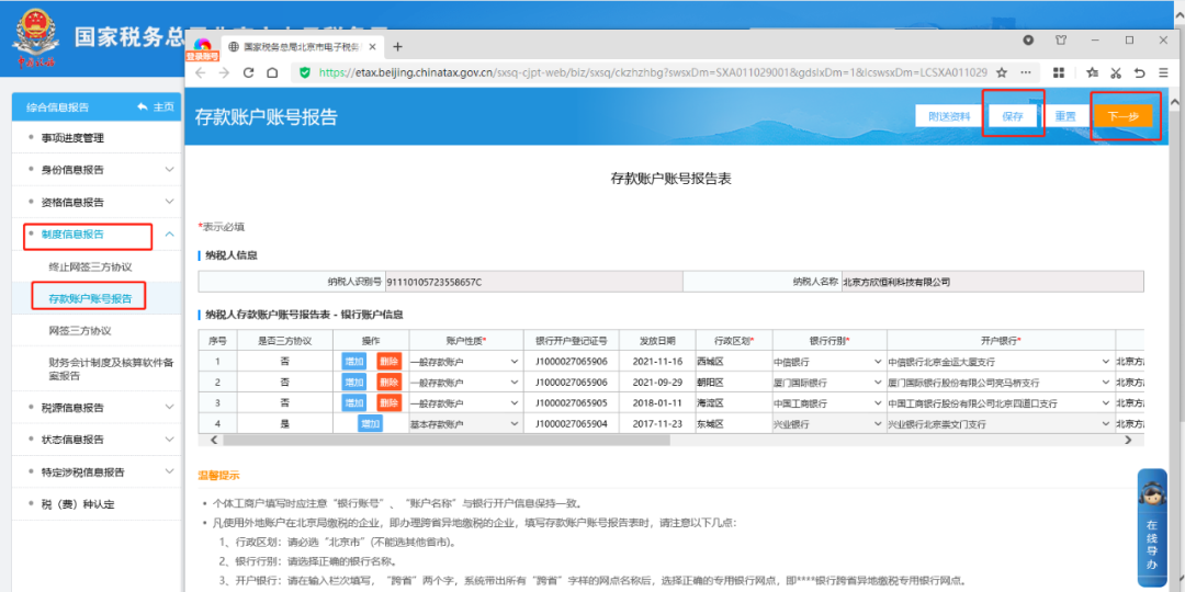 二、存款账户账号报告中修改账户信息,【保存】【下一步】。
