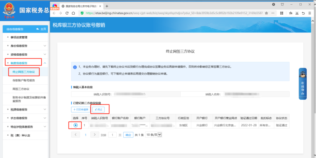 二、制度信息报告—终止网签三方协议先点击【打印】(可以不打出来),再点击【终止协议】。