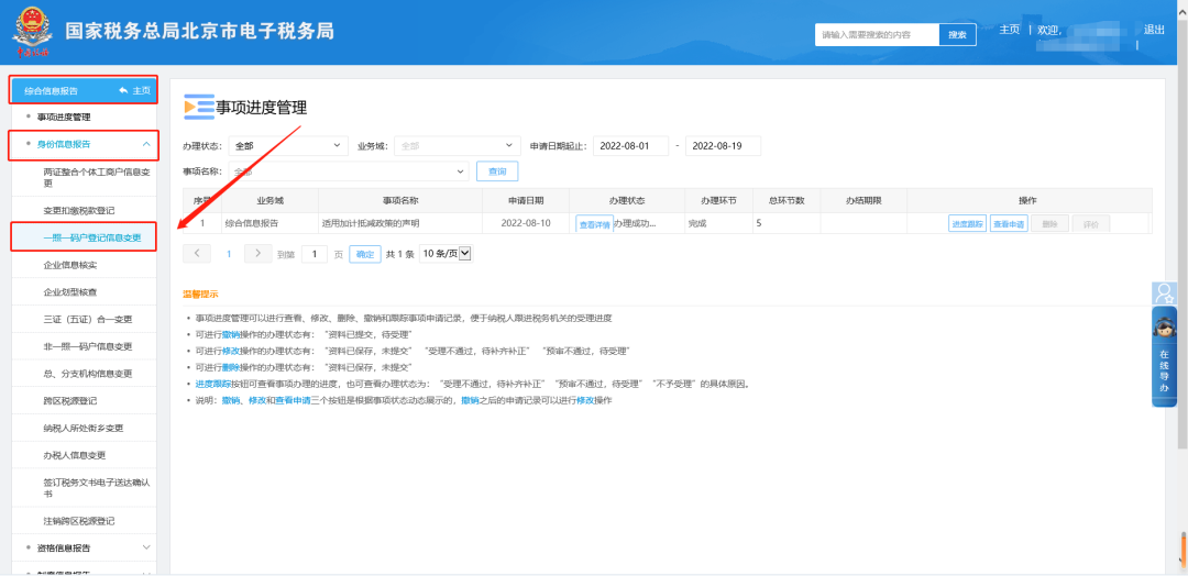 二、综合信息报告—身份信息报告—一照一码户登记信息变更。