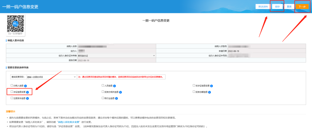 三、勾选【涉证信息变更】看下是否带出变更后的注册地址,带出的话,【保存】—【下一步】即可。