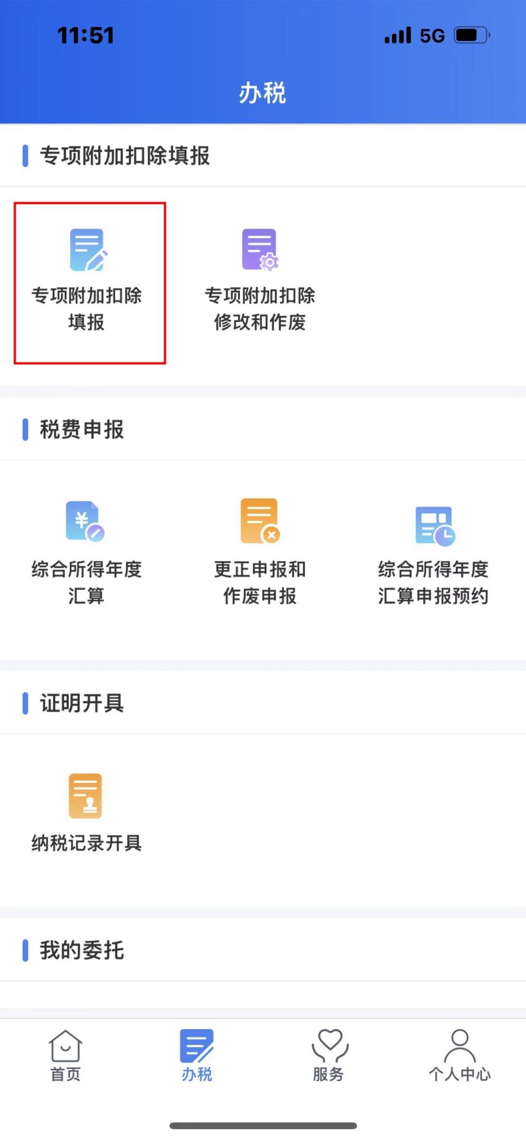 首页点击“我要办税”或“办税”,选择“专项附加扣除填报”进入“专项附加扣除”界面。