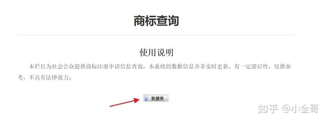 点进去之后,我们就可以看到这个页面,点击我接受即可。在这里有句话值得注意,本系统数据信息并非实时更新,有一定的滞后性。这句话就是咱们常说的盲查期。比如就在前两天有人提交申请了”蓝白咔“(25类)这个商标,因为商标局的系统并非实时更新的,所以在我们检索期间,并没有查到有人已经提交了这个商标,并且也没有什么近似商标,这个时候我们就满怀信心的提交上去,结果最后,比我们先提交的那个人的商标下证了,而我们后提交的商标便会因此被驳回,所以盲查期里面的商标对我们的注册还是有一定影响的,不过一般来说,影响到我们的概率不会很大。