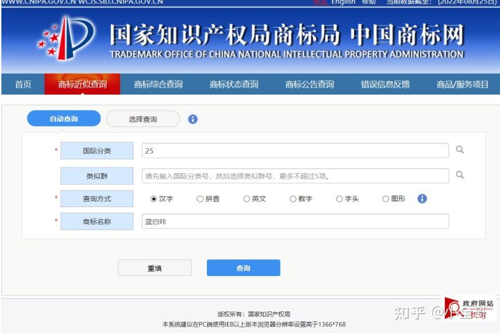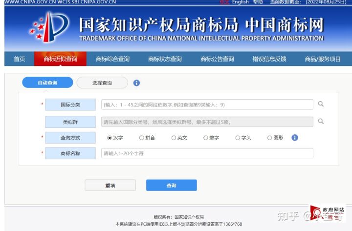 点进去商标近似查询后,我们可以看到这样一个界面,左边写得很清楚,一共四行,我们只需要把其中带星号的三行填完即可。国际分类就是我们的尼斯分类,如果不清楚自己的产品或者行业是哪一类,可以参考文章开头的那个图片或自行百度或者咨询专业人士。