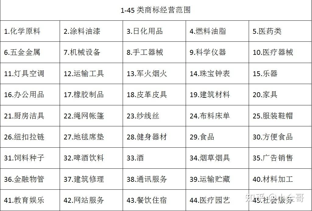 为什么一定要强调某个类别呢,原因是商标一共分为45个类别,如下图。