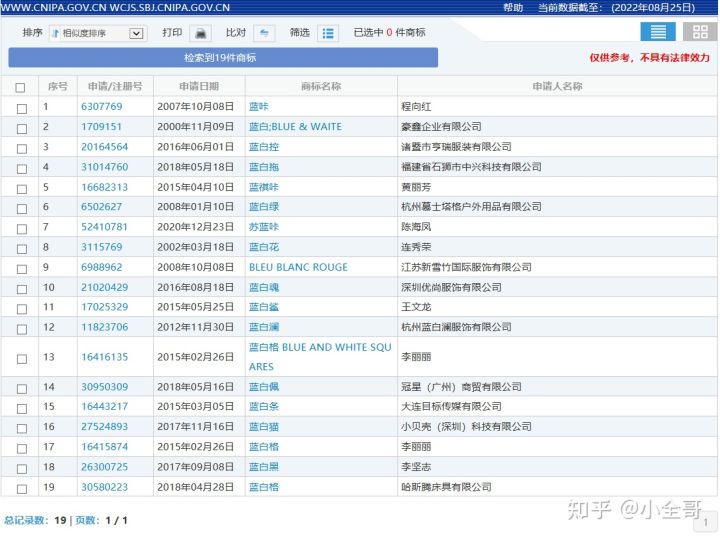 其中蓝咔、蓝祺咔、蓝白控、蓝白拖,这些只相差一个字的商标品牌都是注册成功了的,因此我们的”蓝白咔“这个品牌注册率还是比较大的。如果上述商标只有一两个注册成功,那么我们也与他们只相差一个名字的品牌,注册率就会比较堪忧了。