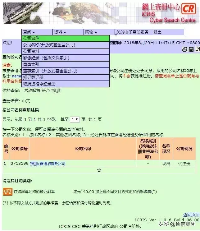 4、点击“搜狐(香港)有限公司”,可以查询到搜狐公司注册详细信息。