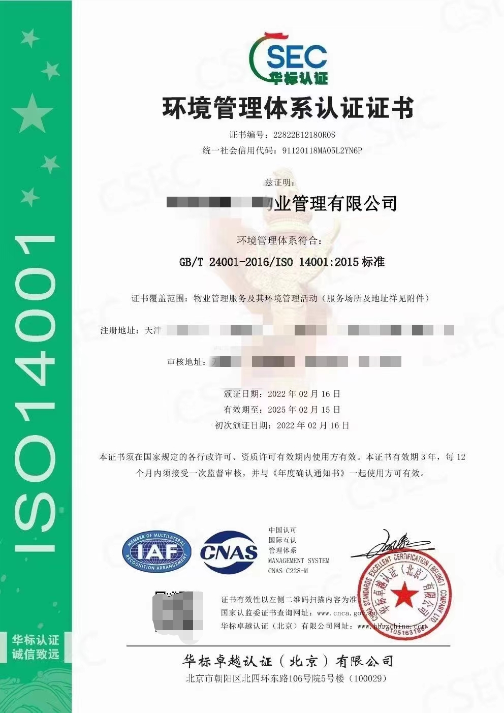 第二种是ISO管理体系认证,属于国家政府机构认可的证书。常见的就是质量管理体系ISO9001、环境管理体系ISO14001、职业健康安全管理体系ISO45001,三体系认证,目前物业行业招投标项目通常作为加分项出现,是比较基础的三个认证项目,参与投标的物业公司必备。相比于第三方机构发的证书,含金量更高,每年办理维护成本需要一定的费用。