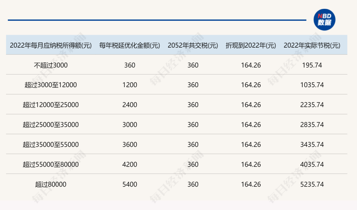 另外,达到起征点且每月应纳税所得额不超过3000元(全年应纳税所得额不超过36000元)的人群,虽然个人养老金无论是否缴存,都适用3%的税率,但考虑到时间价值,税优政策同样具备吸引力。