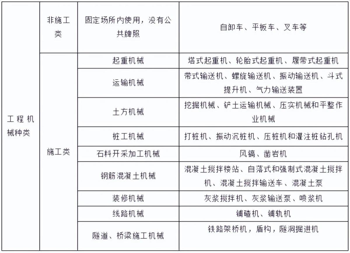 2、施工类:起重机械、运输机械、土方机械、桩工机械、石料开采机械、钢筋混凝土机械、装修机械、线路机械、隧道桥梁施工机械。