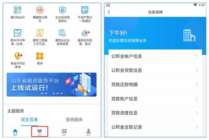 在“爱山东”东营分厅内,点击下方的“服务”,再依次点击“个人服务”—“住房保障”,即可进行住房公积金业务的查询和办理。