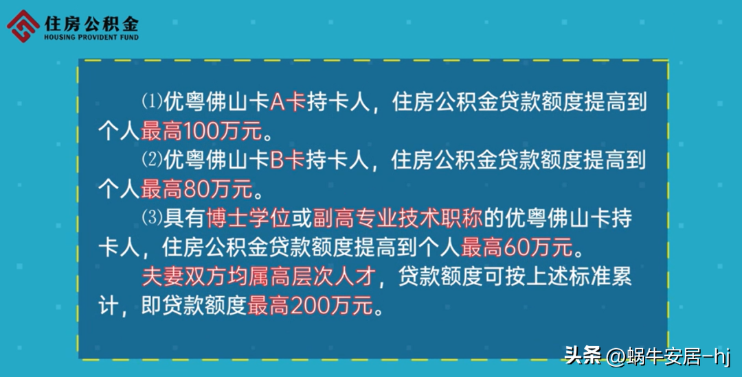 通知指出,优粤佛山卡A卡人才公积金额度提高至100万,夫妻双方均属高层次人才,贷款额度最高200万元。