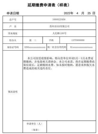 填妥《延期缴费申请表》后,经办人需携带身份证明复印件、营业执照复印件,一并交至苏州市自来水有限公司供水营业厅(姑苏区人民路1100号)。