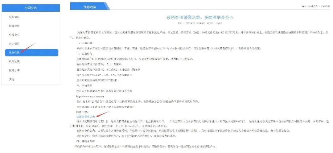 登录苏州市自来水有限公司官方网站www.szzls.com.cn, 首页右上角“公司公告”-“优惠政策”-“疫情纾困缓缴水费、免除滞纳金公告”进行表格下载和申请流程查询。
