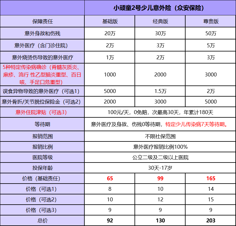 如果预算充足,个人建议选择尊贵版,意外伤残保额更高。至于可选责任,不一定要全部都选上,比如大龄儿童就不大需要加误食异物医疗。但意外骨折/关节脱位保险金还是建议加,不管低龄大龄儿童都有这个风险,只多15块钱,却多了保额5000元,打石膏、上夹板都基本够了。