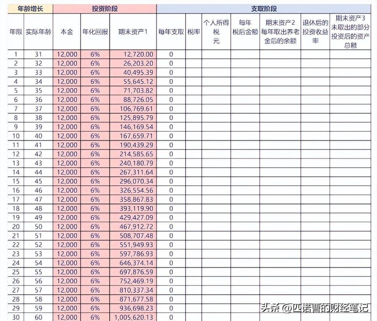 假设30岁开始往个人养老金存钱,每年存1万2,年化收益率在6%。那么30年后,根据复利计算公式,本息将达到1百多万。