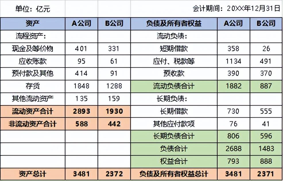 为便于理解,我们举一个案例。假如有A、B两家公司,资产负债表如下: